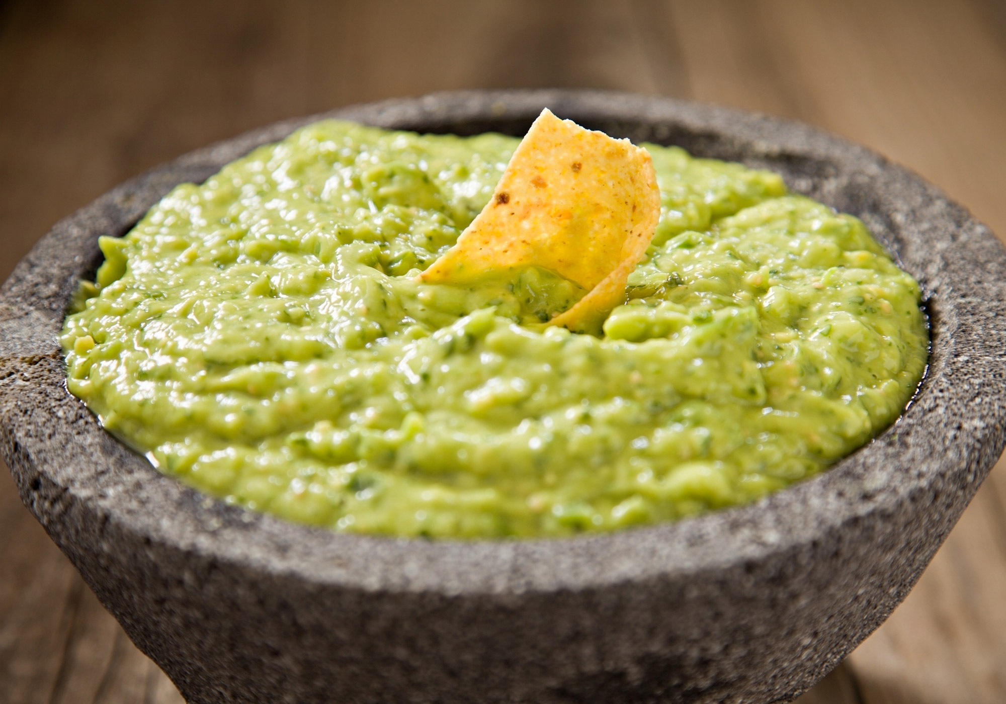 Photo: Tomatillo guacamole and tortilla chip in a stone bowl.