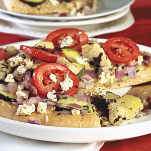 - Crimp edges of dough with fingers to form a rim; coat with cooking spray. Bake at 400° for 9 to 10 minutes or until lightly browned. Sprinkle crust with 1/2 cup cheese blend. Top with vegetable mixture. Sprinkle with 1/4 cup cheese blend. Place tomato slices on top of cheese. Sprinkle with feta cheese and remaining basil and oregano. Bake an additional 6 to 7 minutes or until crust is golden. Serve immediately.