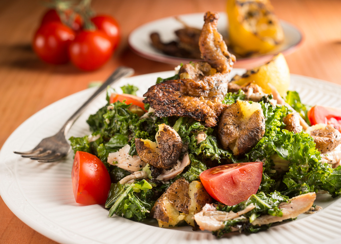 4. Toss the kale with the lime dressing. Add the shredded chicken, beans, tomatoes, and scallions; toss again. Add the cheese and toss lightly to finish.
