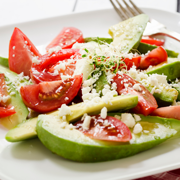 - Arrange onto 2 plates the sliced tomatoes, avocado and cheese crumbles.